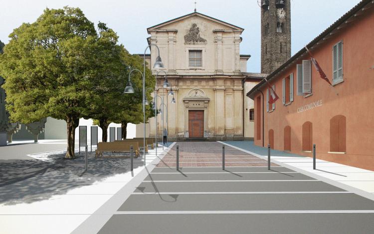 La sistemazione della piazza in realtà, Via alla Chiesa completa la riflessione urbanistica generale sul centro di Novazzano iniziata con la ristrutturazione della ex Casa d'Italia, oggi sede del Municipio e degli uffici comunali. Tale ristrutturazione ha coinvolto anche gli spazi a nord dell'edificio, trasformandoli in giardino pubblico con una vasta area pavimentata destinata alle manifestazioni più diverse. In seguito a questi lavori, la nuova Casa comunale ha visto rinforzarsi la sua “presenza urbana” per il fatto stesso di essere posizionata tra la piazza e il giardino, due spazi pubblici dalle caratteristiche diverse ma complementari. Conformemente alle scelte operate nell'ambito della ristrutturazione dell’ex Casa d’Italia, anche la sistemazione della piazza ha subito interventi di estrema semplicità. La nuova pavimentazione in Gneiss della Riviera ricalca la conformazione e lo sviluppo geometrico della piazza. Alcune panchine ed alberi rinforzano il carattere della parte privilegiata della piazza, rivestita con lastre in Porfido del Trentino e su cui si affacciano la Chiesa e la Casa Comunale.