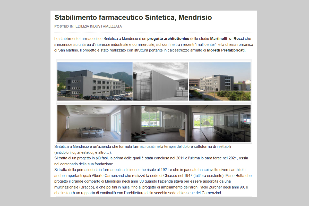 Lo stabilimento farmaceutico Sintetica a Mendrisio è un progetto dello studio Martinelli e Rpsso che s'inserisce su un'area d'interesse industriale e commerciale, sul confine tra i recenti "mall center" e la chiesa romanica di San Martino. Il progetto è stato realizzato con struttura portante in calcestruzzo armato di Moretti Prefabbricati...