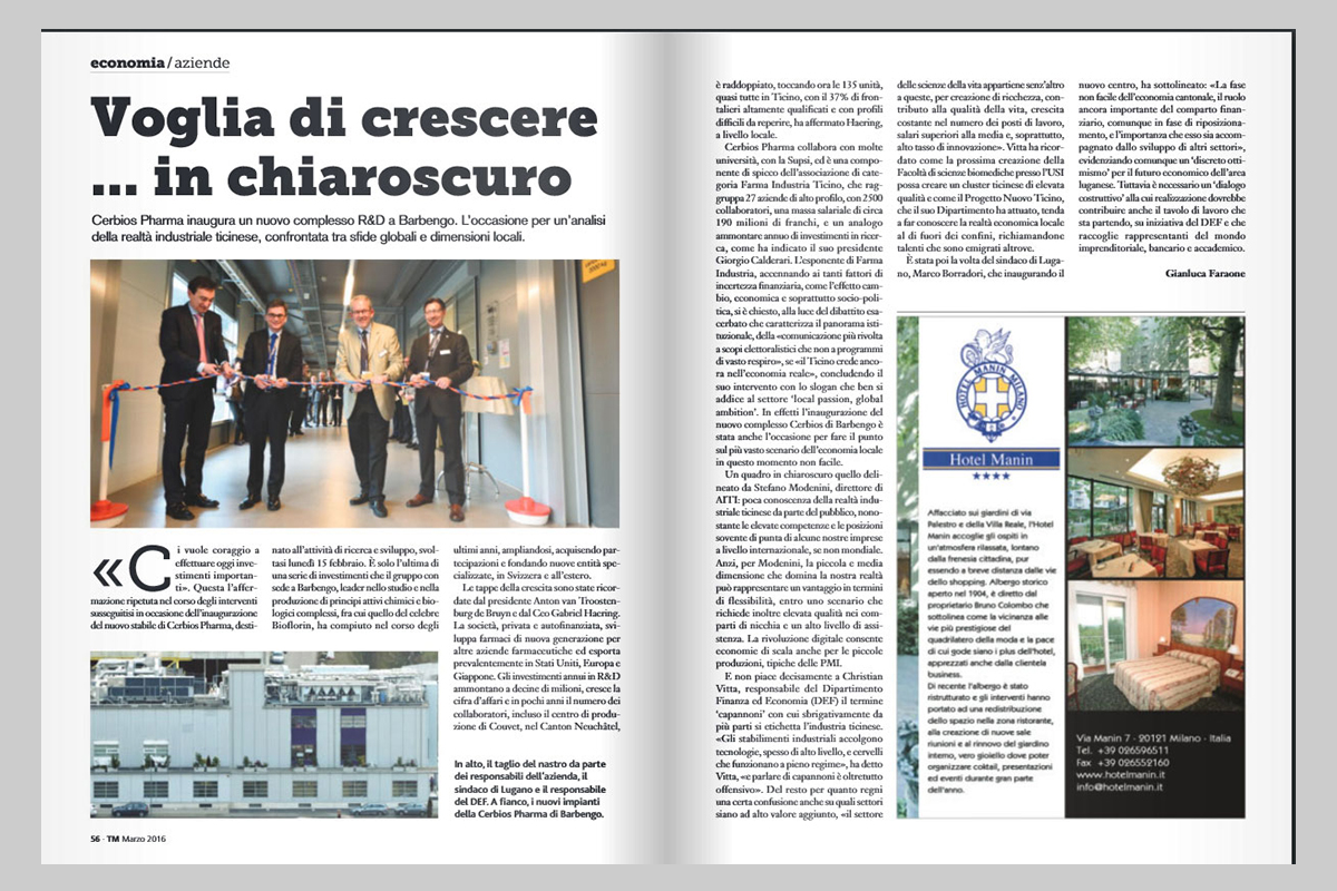 Articolo apparso su Ticino Management, firmato dal giornalista Gianluca Faraone, in occasione dell'inaugurazione di Cerbios Pharma SA a Barbengo, alla presenza dei vertici aziendali, del Consigliere di Stato Vitta e del sindaco di Lugano Borradori.