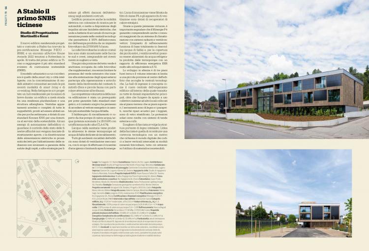 Il nuovo edificio residenziale progettato e costruito a Stabio ha ricevuto la pre-certificazione Minergie P-ECO - SNBS e un'encomio all'Active House Awards 2022 tenutosi a Rotterdam in aprile. Si tratta del primo edificio in Ticino a raggiungere il piú alto standard svizzero di costruzione sostenibile (SNBS).